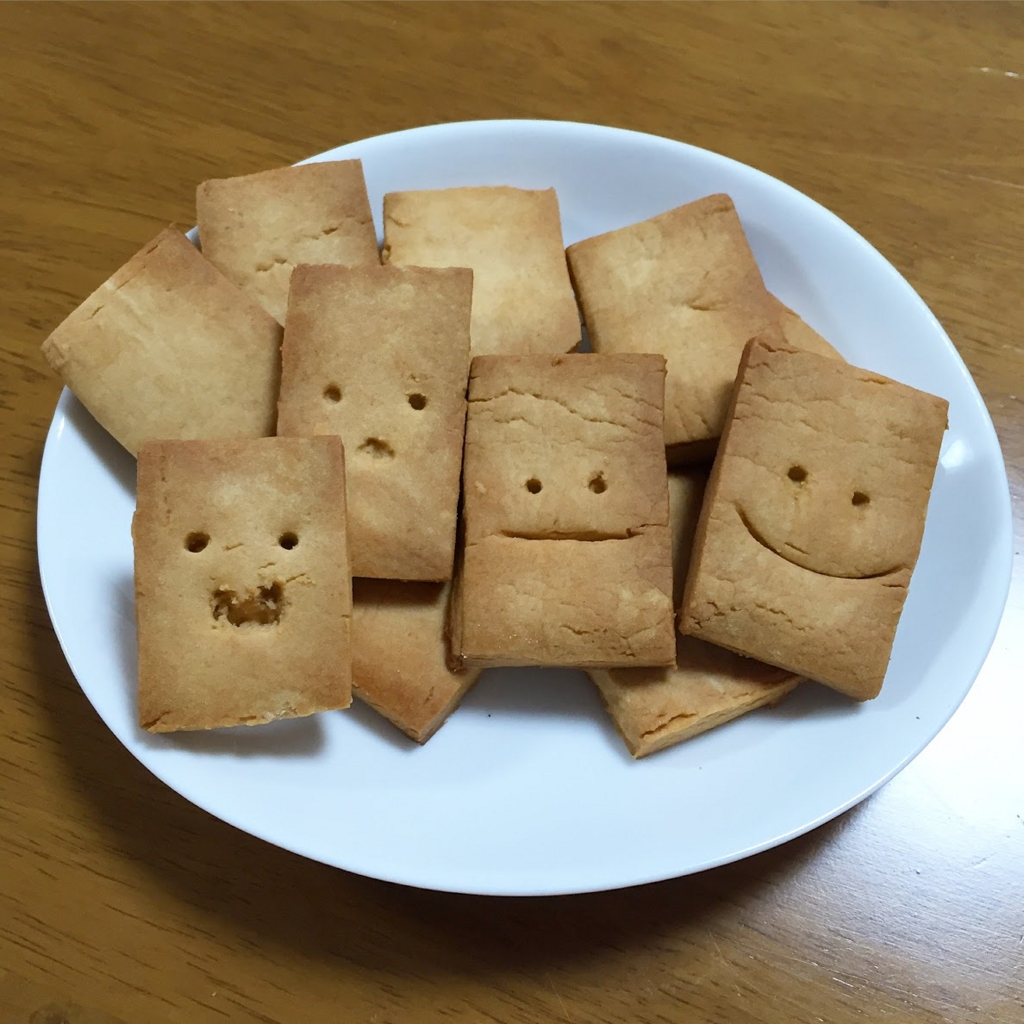 砂糖やバターを使わなくても美味しそうなクッキーが出来そうだと分かったので、適当に作ってみたのが今回のクッキーです。本を真似て顔も描いてみたのですが、絵心無いのでこんなもんです。4つで心折れました。